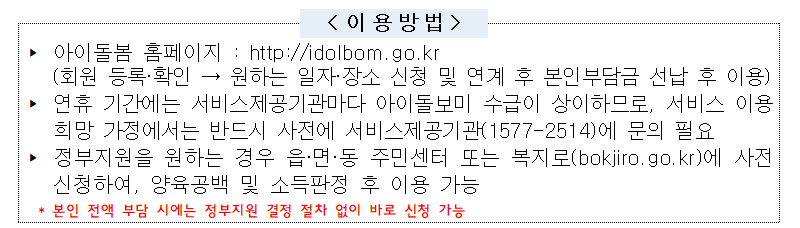 한편 추석 연휴기간에도 돌봄 서비스가 필요한 가정을 위해 아이돌봄서비스를 정상 운영하고 이용요금도 평일 요금(시간당 1만 1080원)을 적용한다.