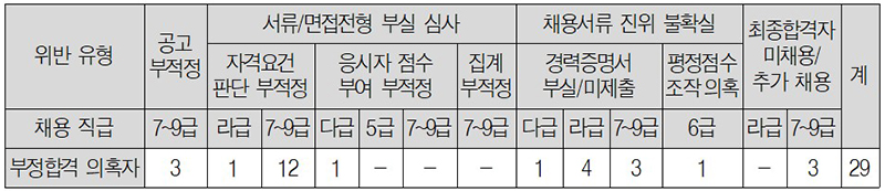 또한 면접위원을 내부위원으로만 구성해 외부 위원을 50% 이상 위촉해야 하는 규정을 위반했으며, 우대기준에 부합하지 않은 가점을 부여하고 응시자가 제출한 경력 등 증빙자료에 대한 검증·확인 절차 없이 181명을 합격자로 임용했다.