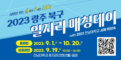 온라인 일자리 매칭은 내달 20일까지 잡코리아 사이트에 개설된 북구 전용 채용관을 통해 이루어지며 오프라인 일자리 매칭데이 행사는 오는 19일 전남대학교 컨벤션홀 일원에서 개최된다.
