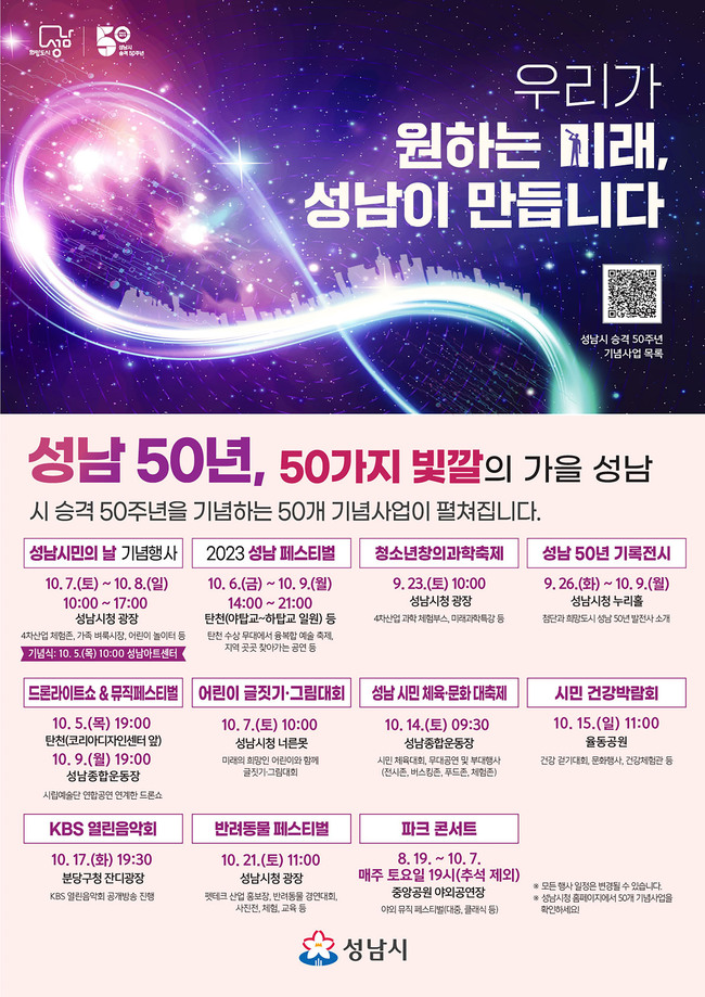 주요 행사 일정은 ▲제50주년 성남시민의 날 행사(10.7~8. 시청 광장) ▲2023 성남 페스티벌(10.6~9. 탄천) ▲청소년 창의 과학 축제(9.23. 시청 광장) ▲성남 50년 기록전시(9.26~10.9. 시청 로비) ▲드론 라이트 쇼& 매직 페스티벌(10.5. 탄천, 10.9. 성남종합운동장) ▲어린이글짓기·그림대회(10.7. 시청 너른못) ▲성남 시민 체육·문화 대축제(10.14. 성남종합운동장) ▲시민건강 박람회(10.15. 율동공원) ▲KBS 열린음악회(10.17. 분당구청 잔디광장) ▲반려동물 페스티벌(10.21. 시청 광장) ▲파크콘서트(8.19~10.7. 매주 토요일. 중앙공원) 등이다.