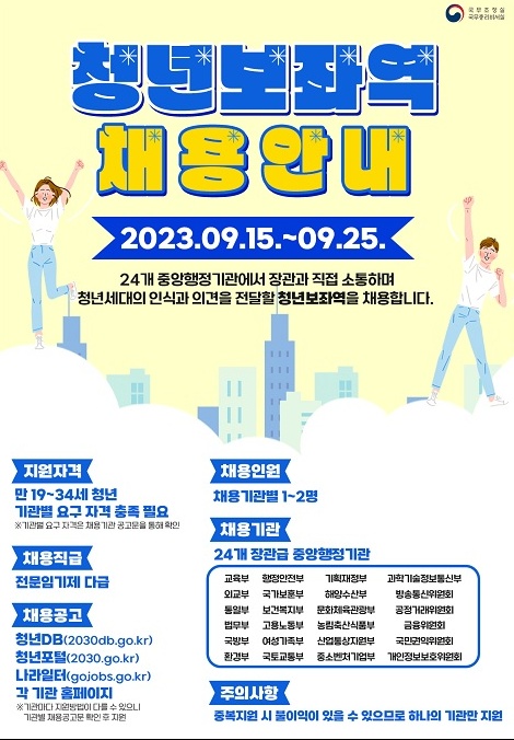 기획재정부 등 24개 장관급 중앙행정기관이 청년의 목소리를 대변할 청년보좌역을 채용하기 위해 15일부터 공고에 들어간다고 국무조정실이 13일 밝혔다.