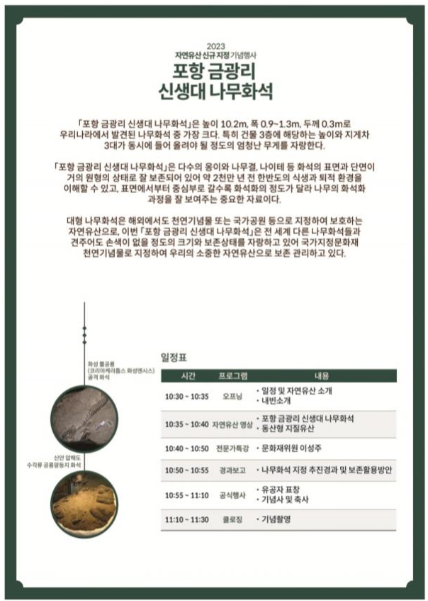 지정 기념행사는 ▲ ‘포항 금광리 신생대 나무화석’ 소개영상 상영, ▲ ‘나무화석 지정의 의미와 가치’ 전문가 특강, ▲ 나무화석을 포함한 동산형 지질유산*의 천연기념물 지정경과와 보존·활용 보고, ▲ 유공자 표창 등으로 진행된다.