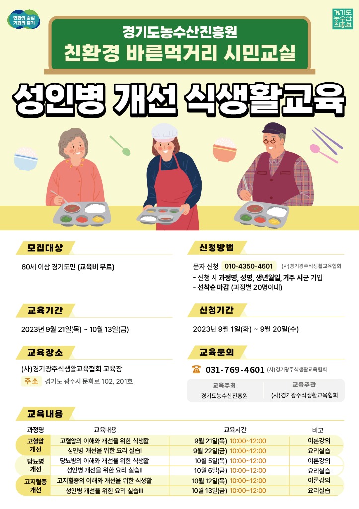 ‘성인병 개선 식생활교육’은 성인병을 겪고 있거나 예방에 관심 있는 60세 이상을 대상으로 진행된다. 고혈압, 당뇨, 고지혈증을 주제로 하며 교육 참가비는 무료이다.
