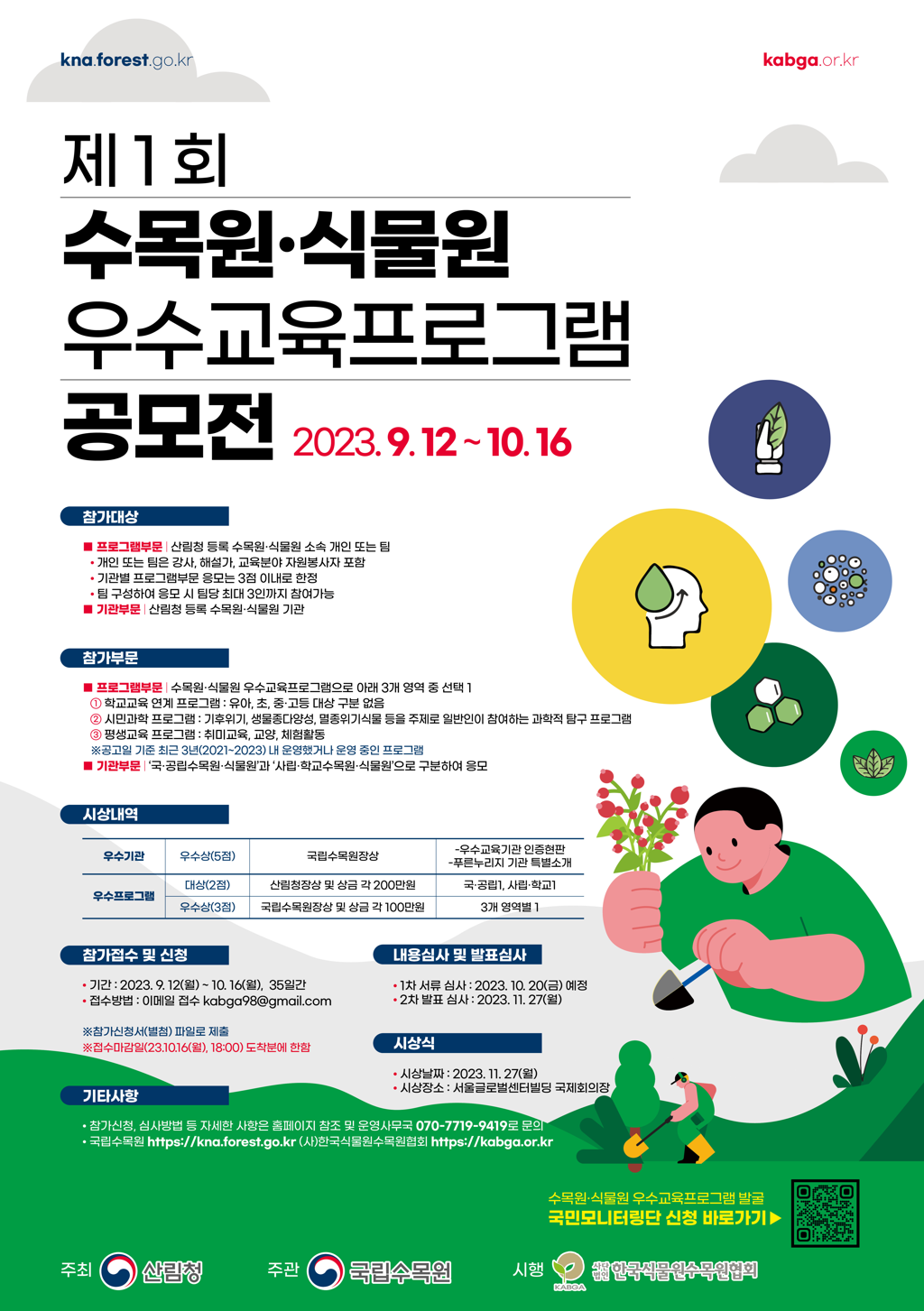 공모분야는 △수목원·식물원 교육프로그램(학교교육연계, 시민과학, 평생교육부문), △우수기관으로, 산림청 등록 수목원·식물원 소속 개인 또는 팀, 기관을 대상으로 하며, 참여자는 1팀 당 3점 이내의 교육 응모가 가능하다.