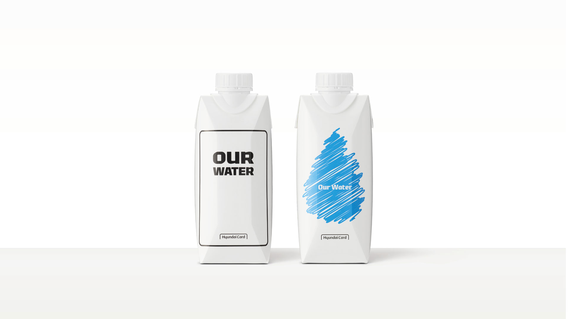 이번에 선보이는 친환경 종이팩 생수 ‘현대카드 아워워터’는 ‘카드(Card)’ ‘드롭(Drop)’ 2종의 디자인으로 출시된다. ‘카드’에는 1대1.58 비율의 신용카드 플레이트 테두리 라인을 그리 신용카드 회사라는 현대카드의 아이덴티티를 나타냈으며, ‘드롭’에는 물을 형상화하기 위해 청량한 느낌을 주는 파란색의 물방울을 표현했다.