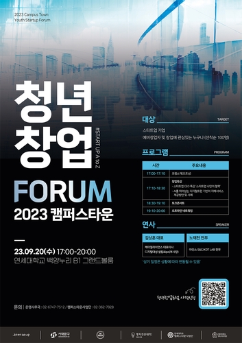 연세대학교 캠퍼스타운사업단이 명지전문대, 이화여대 캠퍼스타운사업단과 함께 9월 20일 17시부터 연세대 백양누리 그랜드볼룸에서 '2023 캠퍼스타운 청년창업포럼'을 개최한다.