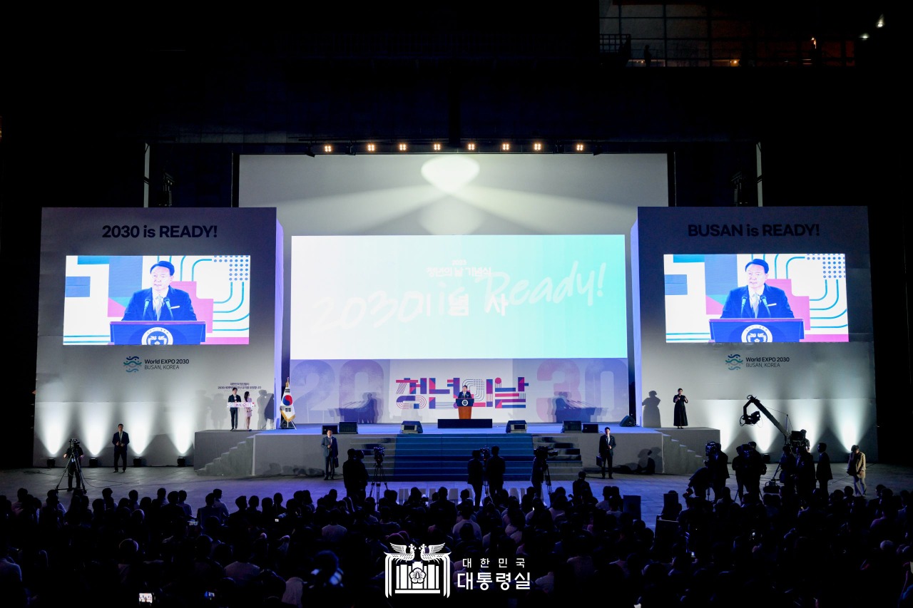 대통령은 참석자들과 함께 응원수건을 높이 들고 “2030 is Ready”라고 외치는 퍼포먼스를 통해 부산 세계엑스포 유치에 대한 강한 의지를 밝혔다.