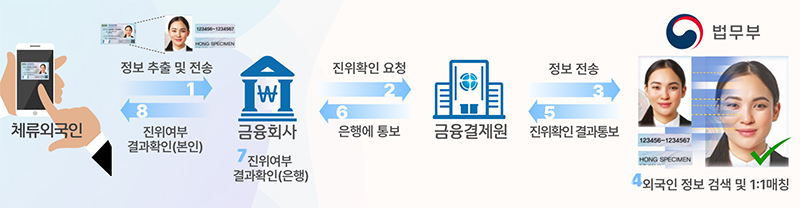 외국인등록증 진위확인 서비스는 외국인이 모바일 앱 등으로 외국인등록증 확인이 필요한 금융업무를 비대면으로 하려는 경우, 금융회사에서 전송한 외국인등록증(영주증, 외국국적동포 국내거소신고증 포함)의 인적정보 및 사진정보와 법무부 보유 정보를 비교해 진위 여부를 판단하고 그 결과를 금융회사에 실시간으로 회신하는 서비스다.