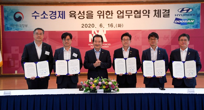 현대자동차는 16일(화) 자운대(대전시 유성구 소재)에서 정세균 국무총리, 환경부 조명래 장관, 국방부 박재민 차관, 산업통상자원부 정승일 차관, 현대자동차 공영운 사장, 두산모빌리티이노베이션 이두순 대표이사 등 주요 관계자들이 참석한 가운데 국방부 수소버스 도입 및 수소충전소 구축 추진을 위한 상호협력 양해각서(MOU)를 체결했다고 밝혔다.