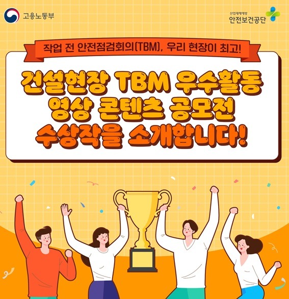 이번 시상식에서 건설현장 9곳의 TBM 우수활동 사례가 고용노동부 장관상(상금 200만원), 안전보건공단 이사장상(상금 100만원)을 수상했으며, 선정된 TBM 우수활동 영상은 고용노동부·안전보건공단 누리집, 중대재해 사이렌, 유튜브 등에 공개하여 중소규모 건설현장에서 적극 활용할 수 있도록 할 계획이다.