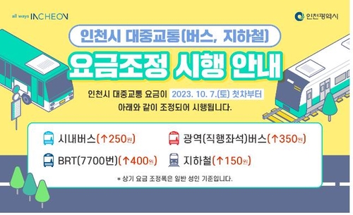 인천광역시(시장 유정복)는 오는 10월 7일(토) 첫차부터 인천 지하철과 버스 요금이 각각 150원, 250원 인상된다고 밝혔다. 섬 주민들의 여객선 운임도 버스 요금과 동일하게 오른다.