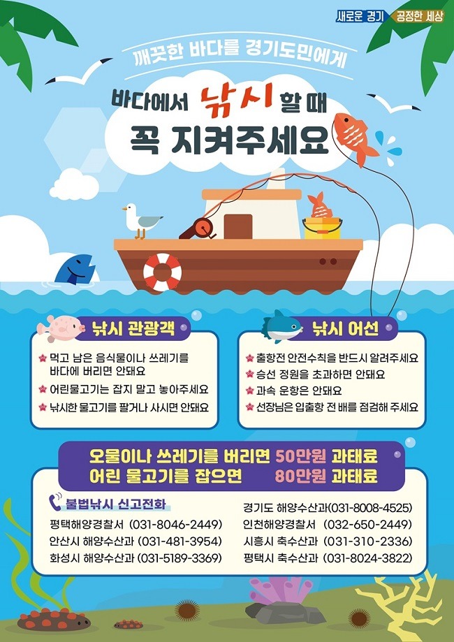 이상우 경기도 해양수산과장은 “여름철 경기도로 낚시를 즐기러 오시는 낚시인들의 안전사고와 해양오염행위 등을 철저히 관리해 도민 누구나 깨끗한 경기바다에서 낚시를 즐길 수 있도록 적극적으로 관리하겠다”고 말했다.