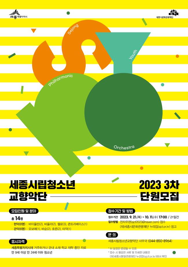 이외 세종시립청소년교향악단과 이번 단원 모집에 관한 기타 자세한 사항은 청소년교향악단(☎044-850-8962)으로 문의하면 된다.