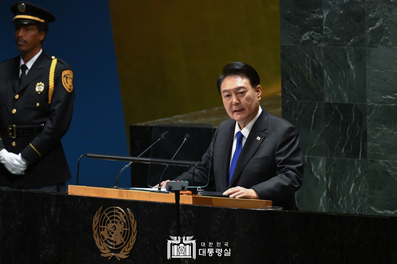 대통령은 “북한의 핵과 미사일 프로그램은 대한민국 평화에 대한 직접적이고도 실존적인 위협일 뿐 아니라 인도·태평양 지역과 전 세계 평화에 대한 중대한 도전”이라며 “유엔 안전보장이사회 상임이사국이 다른 주권 국가를 무력 침공해 전쟁을 일으키고, 무기와 군수품을 유엔 안보리 결의를 정면으로 위반하는 정권으로부터 지원받는 현실은 자기모순적”이라고 비판했다.