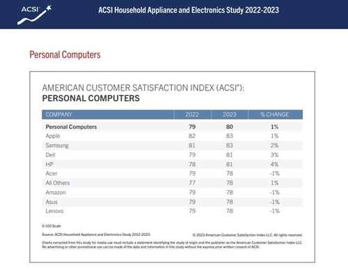 미국 소비자만족지수협회(ACSI)가 20일 발표한 '2023년 소비자 만족도' 보고서에 따르면, 삼성전자는 PC부문에서 83점으로 가장 높은 점수를 받았다.