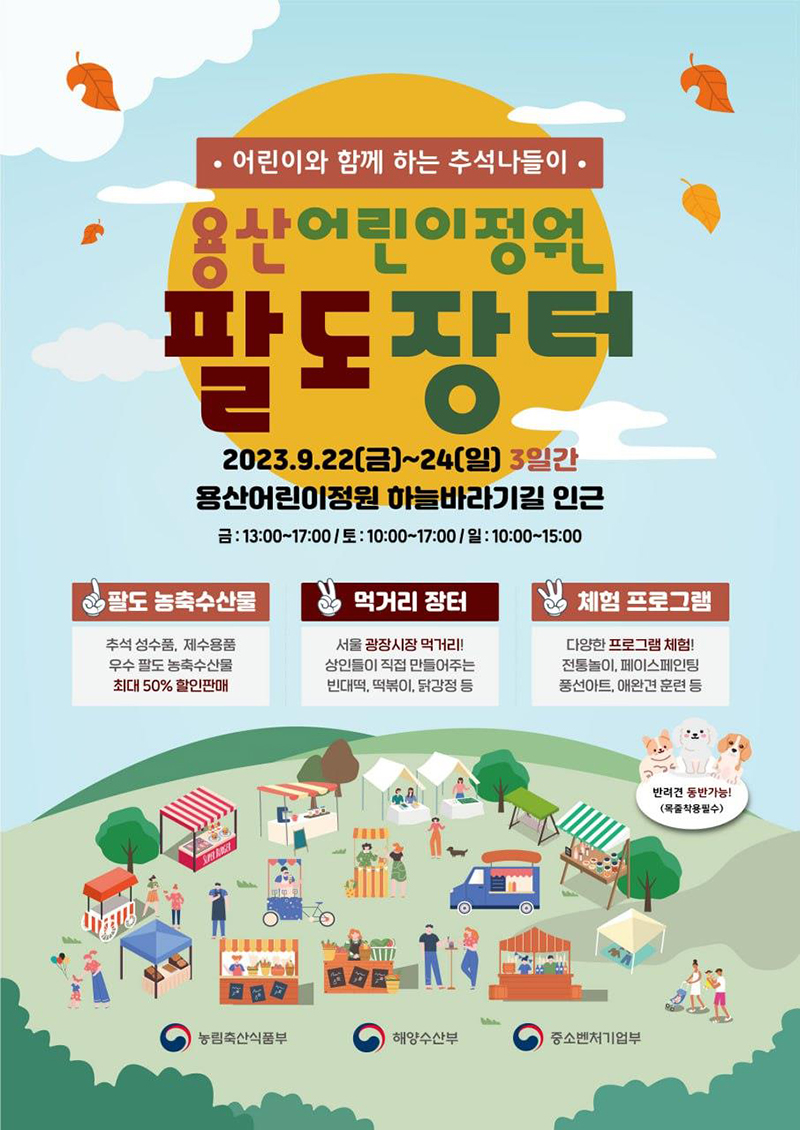 농림축산식품부·해양수산부·중소벤처기업부는 120년 만에 국민에게 개방한 용산어린이정원 하늘바라기길 인근에서 오는 22일 오후부터 24일까지 용산어린이정원 팔도장터를 개최한다고 21일 밝혔다.
