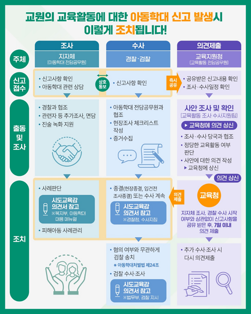앞으로 교원 대상 아동학대 신고가 접수되면 조사·수사기관은 즉시 교육지원청에 공유하게 되고, 교육청은 사안 확인 후 ‘7일 이내’에 교육감 의견을 조사·수사기관에 제출해야 한다.