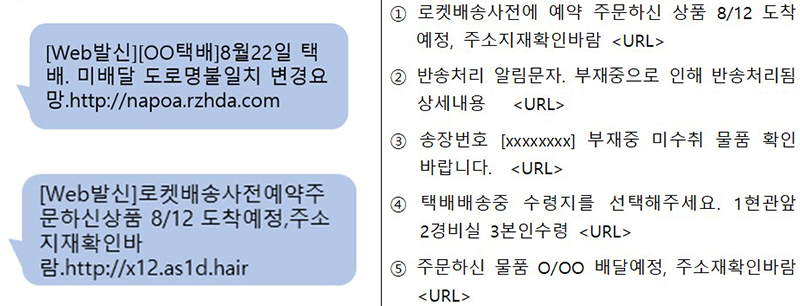 또한 추석 연휴를 앞두고 택배 배송이나 교통범칙금 조회를 사칭한 문자사기(이하 ‘스미싱’)나 지인 명절인사 등으로 위장한 메신저 피싱이 증가할 것으로 우려된다.
