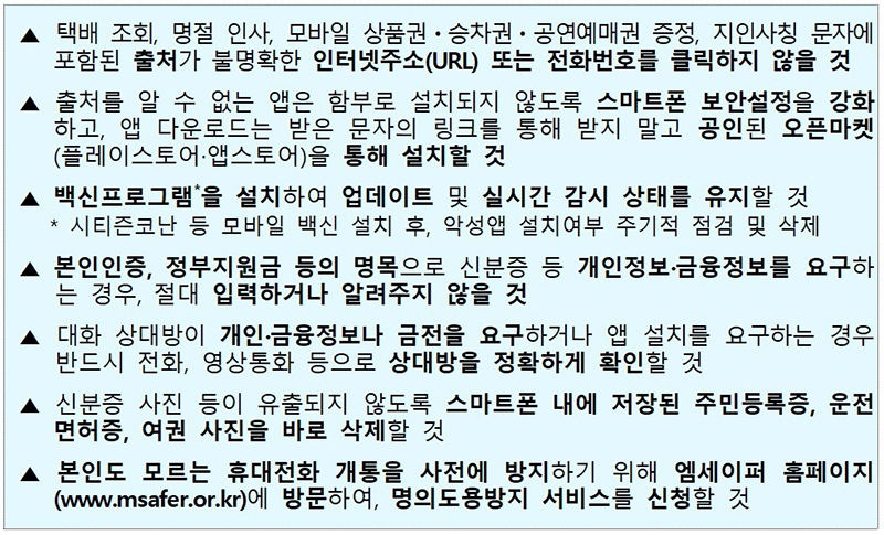 이에 출처가 불분명한 문자의 인터넷주소나 전화번호는 접속을 유의하고, 개인정보나 금융정보를 요구하는 메신저나 전화는 상대방을 정확히 확인해야 한다.