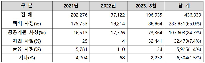 특히 최근 3년간 스미싱 피해 현황을 분석해 보면 택배 배송 사칭 유형이 28만여 건으로 전체의 약 65%를 차지하고 있다.