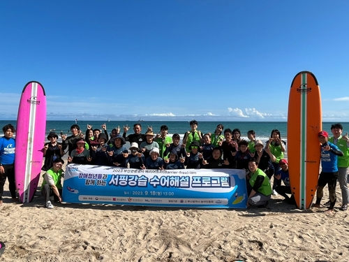 부산관광공사(이하 공사)는 지난 18일 농아인 청년 30여명을 초청해 시티투어 2층 오픈버스 탑승과 함께 부산의 대표 해양레포츠 중 하나인 서핑 체험 행사를 송정해수욕장에서 진행했다.