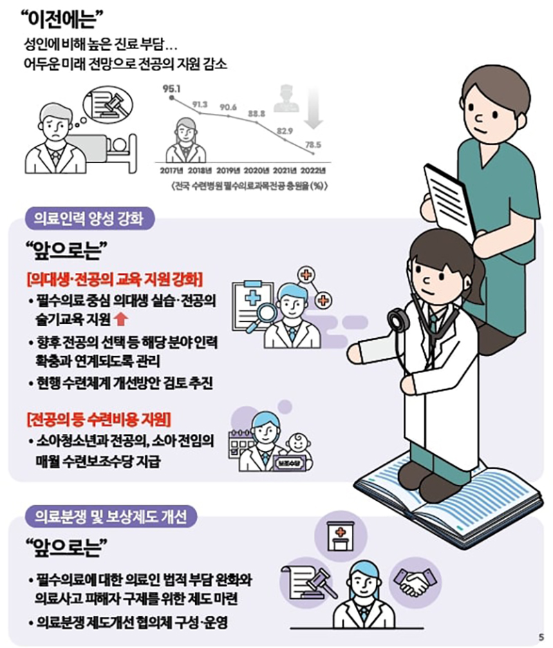 아울러 소아진료 전공을 주저하지 않도록 의대생·전공의 교육 등에 대한 재정지원을 강화하고, 의료분쟁 및 보상제도 개선을 통해 의료인의 법적 부담을 완화하기로 했다.