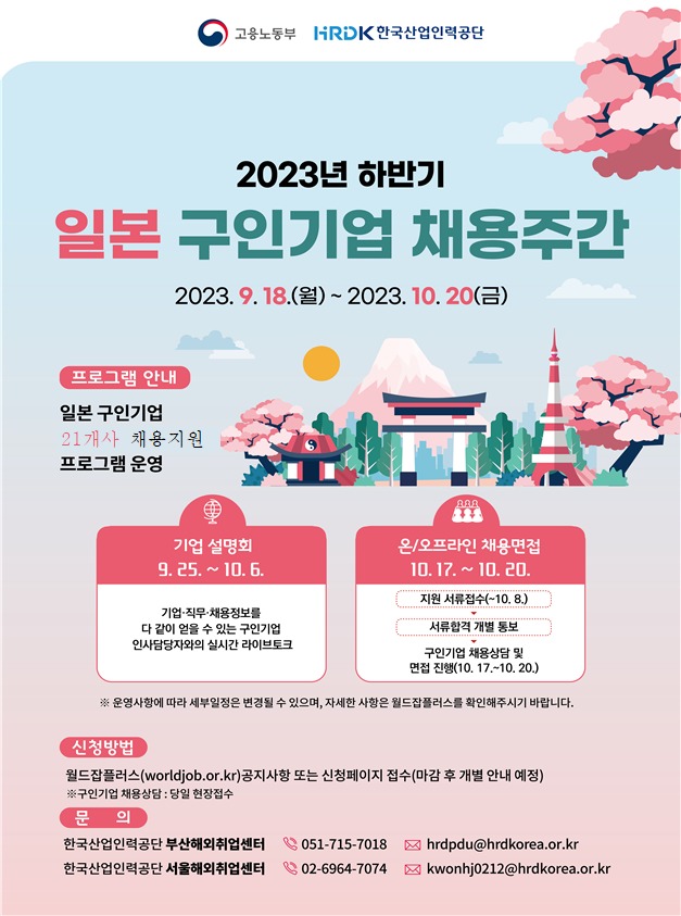 또한 구직자들은 월드잡플러스(www.worldjob.or.kr) 누리집에서 10월 8일까지 채용 면접에 지원할 수 있다. 서류합격자를 대상으로 10월 17일부터 20일까지 현장 또는 온라인 면접이 진행될 예정이다. 그밖에 개인별 특성을 고려한 일본 해외취업 1:1 맞춤형 컨설팅도 진행된다.
