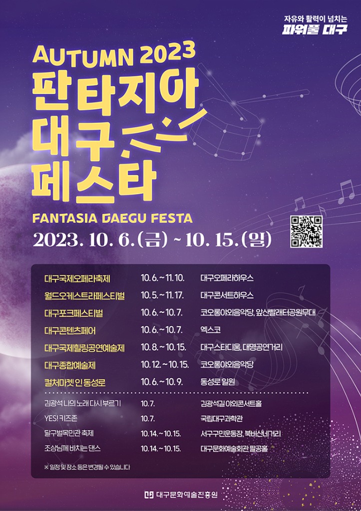 조경선 대구광역시 문화체육관광국장은 “판타지아대구페스타 가을축제를 통해 시민들에게 수준 높은 문화향유의 기회를 제공하고, 문화예술도시 대구의 매력을 대내외에 널리 알리는 계기를 마련하겠다” 고 말했다.
