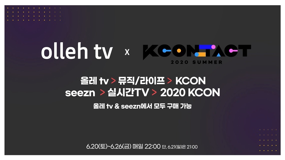 KT(대표이사 구현모, www.kt.com)가 오는 20일부터 26일까지 7일간 CJ ENM과 함께 ‘케이콘택트 2020 서머(KCON:TACT 2020 SUMMER)’를 올레 tv와 Seezn(시즌)에서 생중계한다고 19일 밝혔다.