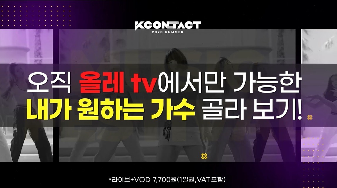 오는 20일 22시부터 7일간 진행되는 본 행사에는 강다니엘, 마마무, 몬스타엑스, 아이즈원, 청하 등 국내 대세 K팝 아티스트 33개팀이 총출동하며, 일별 4~5개 팀이 출연한다. 라이브 공연 시청을 원하는 고객은 올레 tv와 Seezn(시즌)에서 1일권을 7,700원(부가세 포함)에 구매해 이용할 수 있으며, 생중계 이후 제공되는 VOD도 무료로 감상할 수 있다. (※메뉴 위치: 올레 tv 홈>KCON / Seezn 홈>카테고리>뮤지션 Live)