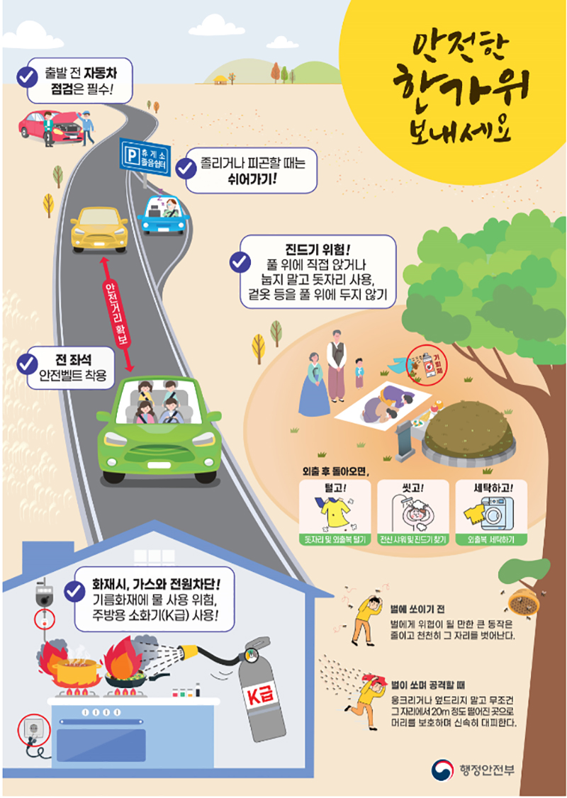 이에 행정안전부는 추석연휴 귀성·귀경길 교통사고는 물론 명절 음식 준비로 인한 화재 등 안전사고에 각별한 주의를 요청했다.