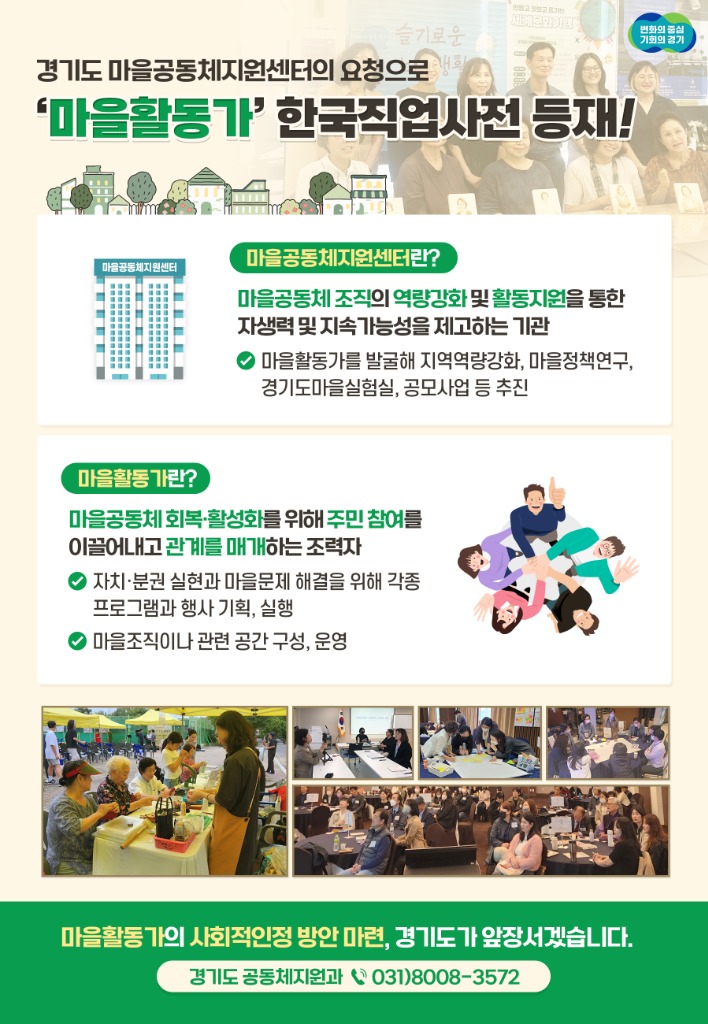 마을공동체 회복·활성화를 위해 주민 참여를 이끌어 내고 관계를 연결하는 조력자인 ‘마을활동가’가 경기도 건의로 하나의 직업으로 공식 인정됐다.