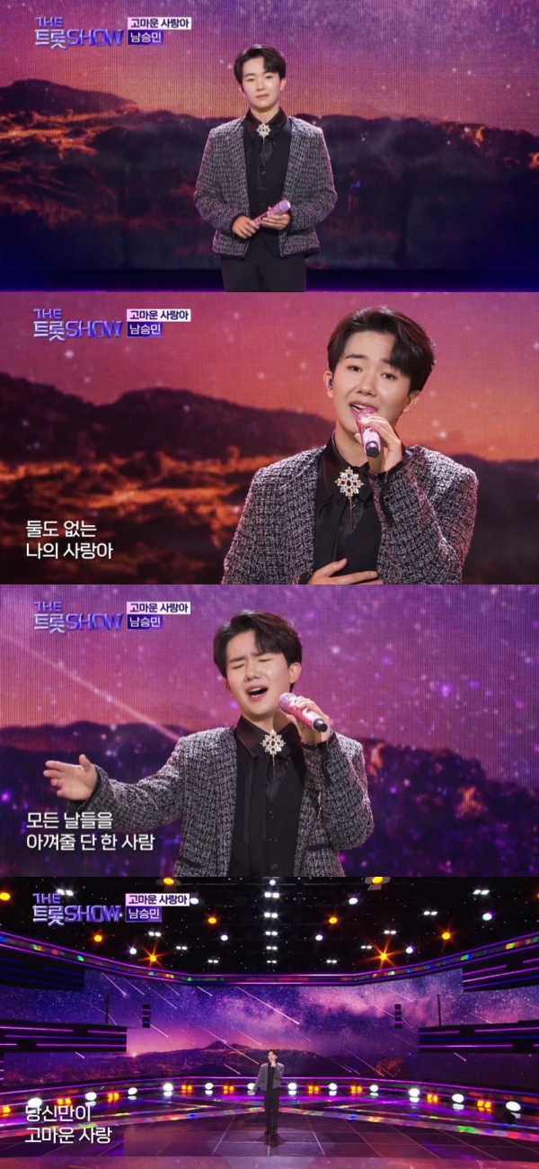 지난 25일 저녁 8시 방송된 SBS FIL, SBS M ‘더트롯쇼’에 남승민이 출연해 ‘고마운 사랑아’ 무대를 선보였다.