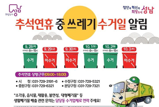 성남시는 추석 연휴 기간 (9 월 28 일 ~10 월 3 일 ) 쓰레기로 인한 주민 불편을 최소화하고 쾌적한 지역 환경을 마련하기 위해 청소기동반을 편성 · 운영한다.