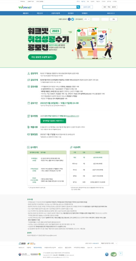 공모 접수 기간은 9월 26일(화)부터 10월 31일(화)까지이며, 공모 자격은 워크넷을 이용해 구직활동을 했거나 워크넷을 통해 취업에 성공한 회원이다.