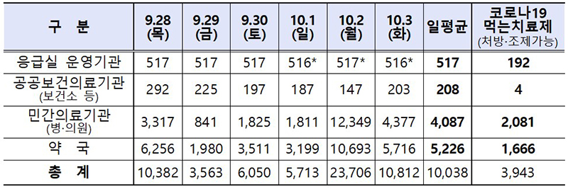 또한 응급환자를 위해 응급실 운영기관 510여 곳은 명절 기간 평소와 동일하게 24시간 진료하며 다수의 민간의료기관이 문을 닫는 추석 당일인 29일에도 보건소를 비롯한 일부 공공보건의료기관은 진료를 계속한다.