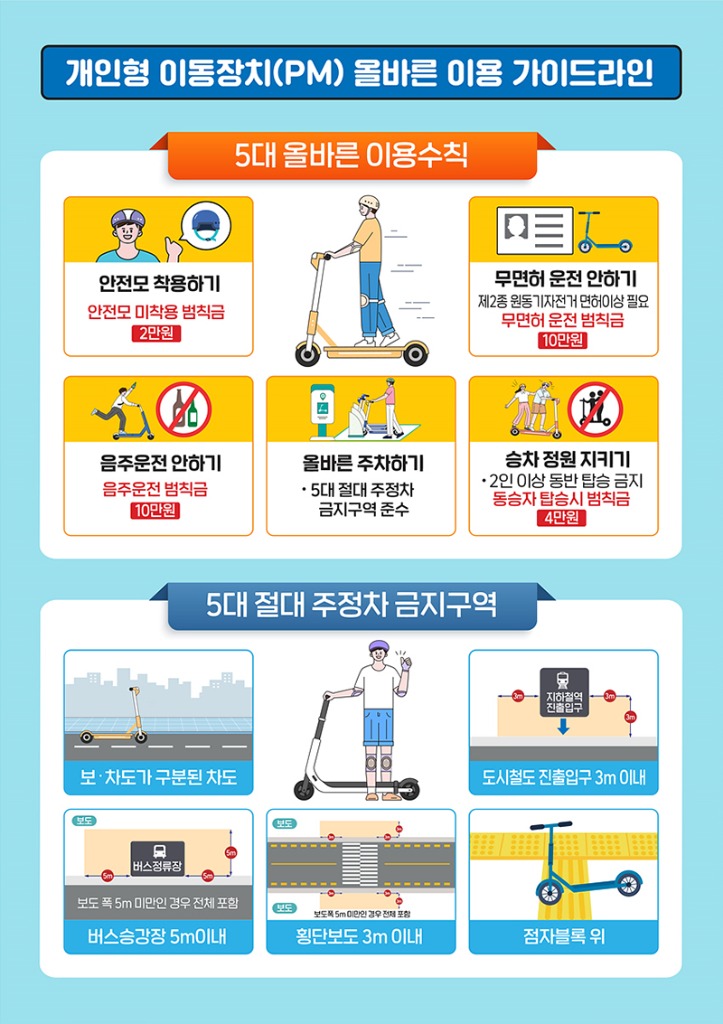 ‘개인형 이동장치(PM) 5대 이용수칙’은 PM사용이 빠르게 늘어나 교통사고도 이에 따라 급증하고 있어 이용자의 올바른 이용문화가 정착이 절실해 현재 민·관 합동으로 대시민 인식개선 운동을 전개하고 있다.