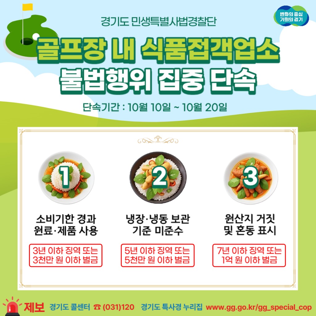 경기도 특별사법경찰단은 10월 10일부터 20일까지 화성시 등 12개 시군 골프장 내 클럽하우스 등 식품접객업소 150곳을 대상으로 불법행위를 집중 단속한다.