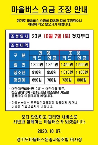 고양특례시의 마을버스 요금이 10월 7일부터 150원 인상된다.