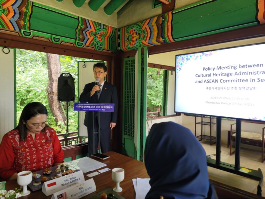 문화재청은 9월 27일(수) 오후 3시, 창덕궁 가정당(서울 종로구)에서 주한 아세안 10개국 대사단과의 정책간담회를 개최하고 지난해 11월 출범한 한-아세안 문화유산 협의체(이하 ‘협의체’)의 성과를 공유하고 협력 강화 방안에 대해 논의했다.