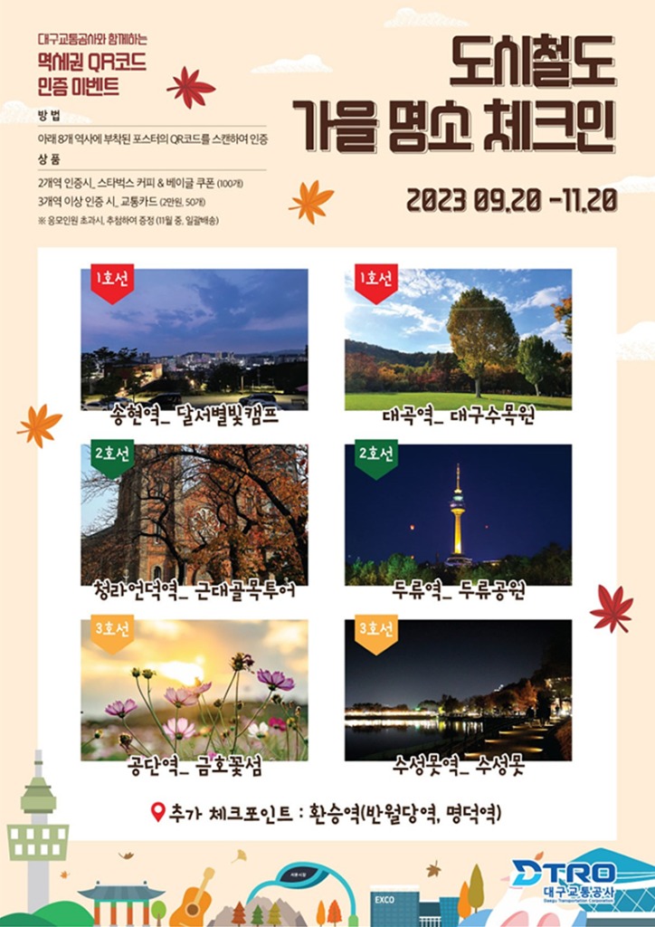 이번 이벤트는 9월 20일(수)부터 11월 20일(월)까지 약 2달간 진행된다. 이벤트 대상 역사는 가을 명소 인근에 위치한 1호선 대곡역(대구수목원), 송현역(달서별빛캠프), 2호선 청라언덕역(근대골목), 두류역(두류공원), 3호선 공단역(금호꽃섬), 수성못역(수성못)과 환승역인 반월당역, 명덕역 등 총 8곳이다.