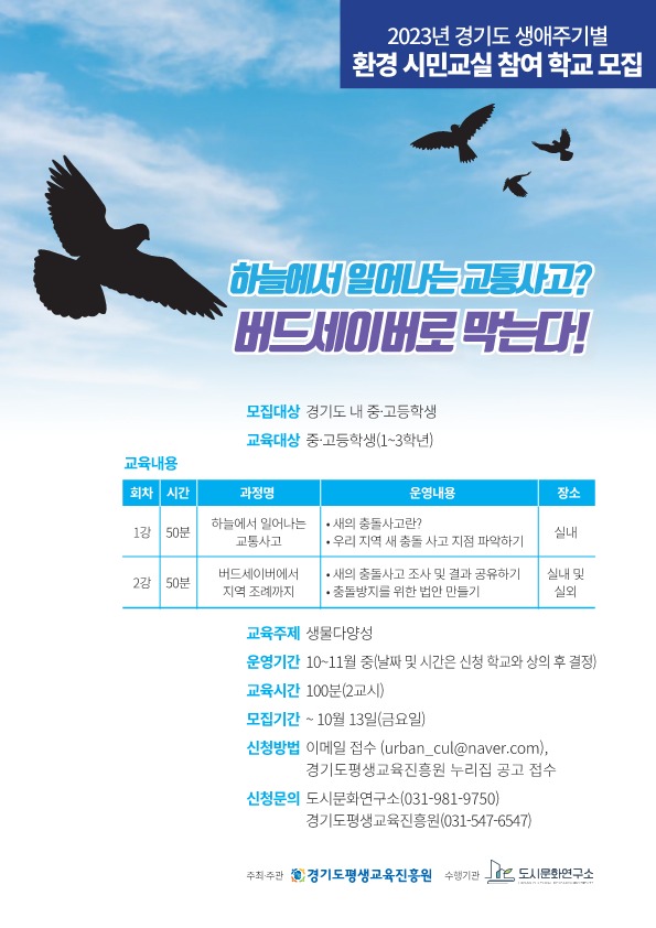 경기도평생교육진흥원은 지속가능한 미래를 위한 기후시민의식 함양과 생애주기에 맞는 생태환경 감수성을 높이기 위해 찾아가는 생애주기별 환경 시민교실을 운영한다며, 10월 13일까지 참여 학교 및 기관을 모집한다.