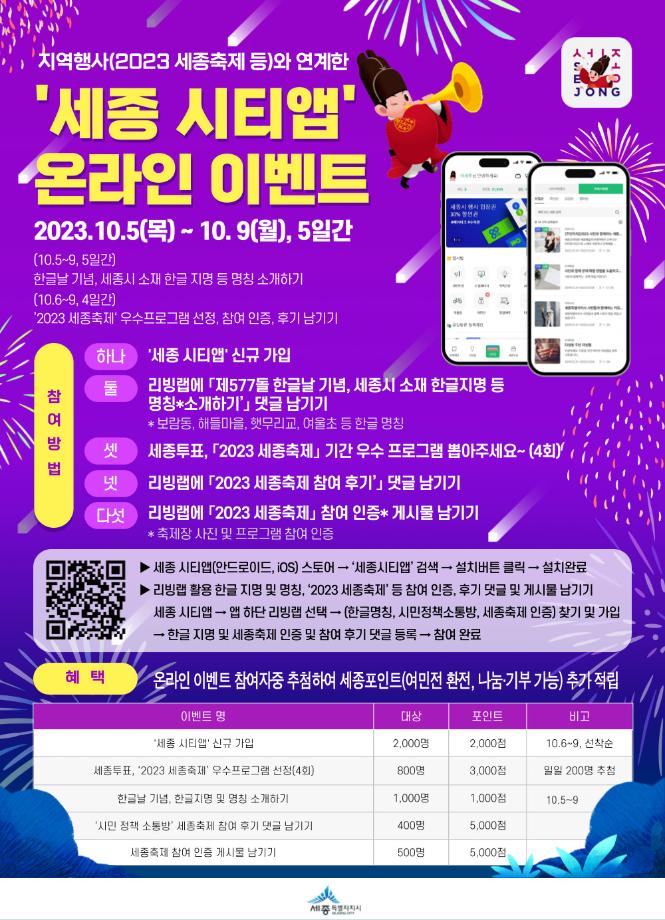 온라인 이벤트로는 세종시티앱 신규 가입을 비롯해 한글 지명·공공건축물 소개글 남기기, 세종축제 우수 프로그램 선정, 축제 참여 인증 및 후기 남기기 등이 진행된다.