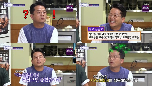 이후 게스트들의 논쟁거리로 열띤 토크를 펼치던 김준호는 이상민에게 “형을 만든 건 빚이야 이혼이야?“라는 급 돌직구 질문으로 이상민 저격수로 맹활약했다.