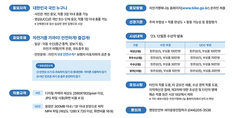 특히 수상자에게는 행안부장관 상장과 부상품이 주어지며, 작품은 자전거 안전 교육과 캠페인, 홍보물, 전시 등 자전거 이용 활성화 정책자료 등으로 활용한다.