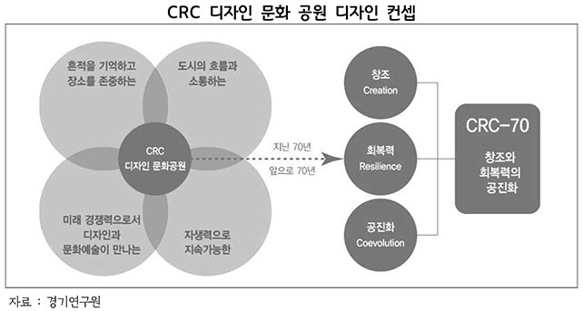 이에 연구원은 근현대 역사적 가치를 보유하고 있는 캠프 레드클라우드(CRC)의 장소적 특성을 재발견하고 공간 특성에 의해 축적된 경험의 가치를 콘텐츠로 활용하고자 ▲흔적을 기억하고 장소를 존중하는 캠프 레드클라우드(CRC) 디자인 문화 공원 ▲도시의 흐름과 소통하는 캠프 레드클라우드(CRC) 디자인 문화 공원 ▲미래에 경쟁력을 갖추기 위한 역량으로서 디자인과 문화예술이 만나는 캠프 레드클라우드(CRC) 디자인 문화 공원 ▲자생력으로 지속가능한 캠프 레드클라우드(CRC) 디자인 문화 공원의 4가지 기본구상과 함께 캠프 레드클라우드(CRC) 공간 특성을 고려한 6개 구역별(스포츠, 지역관광, 미래에너지, 디자인, 상업, 지역산업) 클러스터 조성 방안을 제시했다. 향후 70년 창조(Creation)와 회복력(Resilience)의 공진화(Coeveolution)를 이루는 디자인 문화 공원을 상징하는 개념인 ‘변화로 미래를 창조하는 CRC-70’을 도출, ‘CRC-70’의 브랜드화도 제시했다.