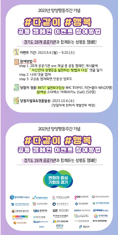 재단은 28개 경기도 공공기관과 연계해 도내 성평등 문화 확산에 동참하자는 의미로 ‘다같이, 행복’ 캠페인 영상을 제작하고 이와 관련한 영상을 누리소통망(인스타그램, 페이스북, 블로그)을 통해 해시태그(#다같이 #행복)를 달아 공유하는 이벤트를 9월 4일부터 20일까지 진행했다. 그 결과 850여 명의 도민이 성평등 문화확산에 동참, 응원의 메시지를 보냈다.