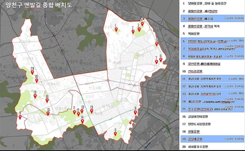 수립된 기본계획에 따르면 구는 기존 안양천공원·목동교 황토길(570m)과 올해 5월 신규 조성한 안양천 오금교 황토길(150m)을 정비하고, 연말까지 목2동 용왕산(260m)과 신월7동 곰달래공원(270m)에 맨발흙길 신규 조성을 시작으로 2025년까지 총 20곳을 추가 확충할 방침이다.