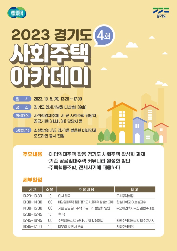 경기도는 5일 경기도인재개발원에서 경기도 테마형 임대주택 공급 방안 등 사회주택 활성화를 위한 ‘제4회 경기도 사회주택 아카데미’를 개최했다.