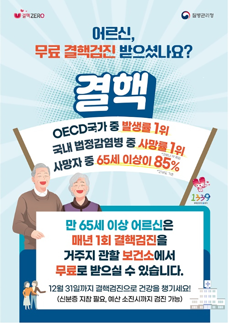 특히 어르신이 많이 방문하는 동네 병·의원, 한의원, 노인시설 등에 홍보 포스터를 부착해 무료 결핵검진을 아직 실시하지 않으신 어르신들이 거주지 관할 보건소로 방문하실 수 있도록 안내할 예정이다.